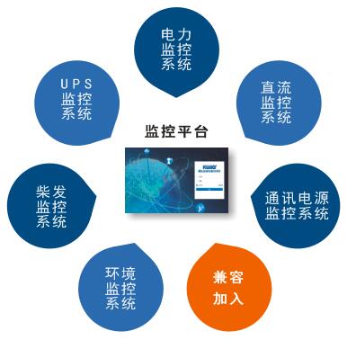 综合监控管理系统包括:电力监控系统、工艺配电监控系统和工作环境监控系统三个独立的子系统。综合监控管理系统包括对高低压配电柜、变压器、柴油发电机组设备的监控;工艺配电监控系统包括对UPS,蓄电池的监控;工作环境监控系统包括温湿度、烟感、水浸等环境传感器的参数监测,以及视频监控、门禁监控、防雷监控、漏电监测等安防安全监控设备的实时监控,实现对机房系统外部环境工作状态的监测。