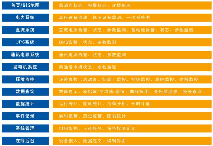 雷达站综合电力监控系统包含有电力监控子系统、直流监控子系统、UPS监控子系统、通讯电源监控子系统、柴油发电机监控子系统、环境监控子系统等子系统。各子系统为独立模块,互不影响;各模块可以自由组合,构成统一监控平台。