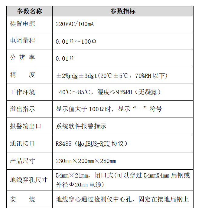 产品具有在线测量、非接触测量、地线穿心通过、不影响防雷接地效果和设施的正常运行,无需自检、实时检测、采用RS485有线通信。检测仪内置传感器与电路板防雨防尘,确保野外、矿井下、室内等长时间在线监测的高精度、高稳定性、高可靠性。